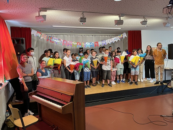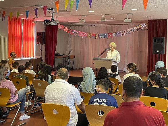Am Freitag (27.08.22) nach den Sommerferien begrüßten der stellvertretene Schulleiter Tillmann Schneider und Jahrgangsleiterin Birte Unger zahlreiche Eltern und Geschwister sowie die knapp 60 neuen Schüler:innen des 5. Jahrgangs zur Einschulungsfeier in der schuleigenen Mensa.