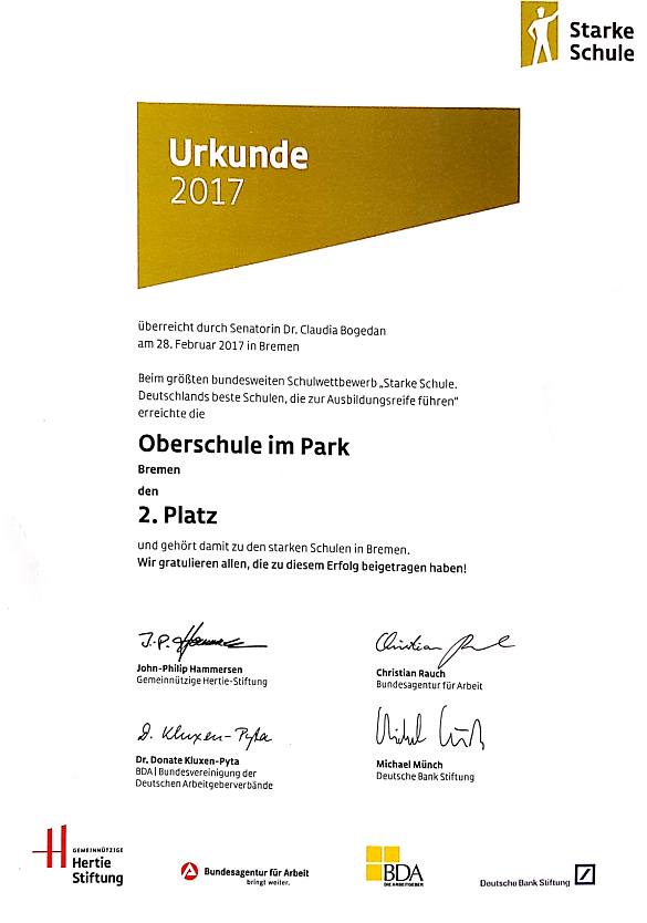 Oberschule im Park gewinnt den 2. Preis beim Wettbewerb "Starke Schule"